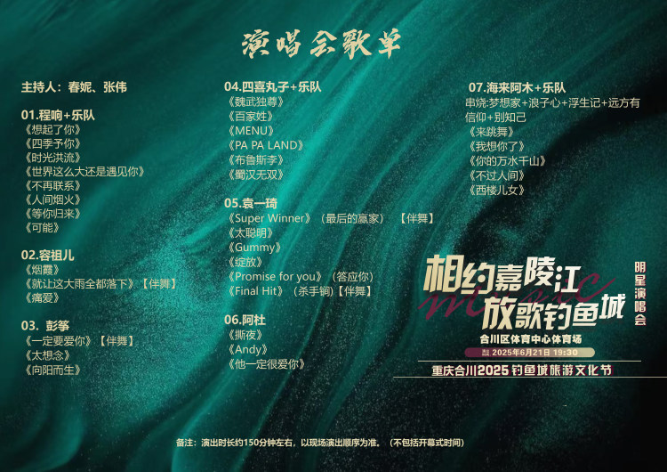 6月21日19:30,2025钓鱼城旅游文化节开幕式将在合川区体育中心体育场正式举行,现场还将开展“相约嘉陵江·放歌钓鱼城”明星演唱会。值得一提的是,本次演唱会是合川区自2011钓鱼城旅游文化节引进VITAS、杨坤等群星演唱会之后,时隔14年再次市场化引进大型演唱会,届时,容祖儿、阿杜、海来阿木、程响、袁一琦、四喜丸子、彭筝等歌手将带来众多热歌金曲。据悉,本次开幕式及演唱会现场预计将有超1.5万名观众观演。